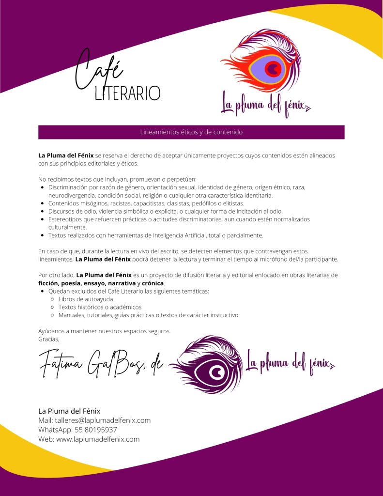 Te invitamos a consultar nuestros lineamientos éticos y de contenido para el Café Literario de La Pluma del Fénix, mismos que también comparte nuestra línea editorial.